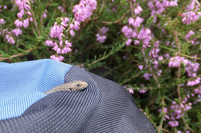 At lunchtime, we were visited first by a Red-veined darter dragonfly, which landed on a volunteer's shirt, and then by a Common lizard which was on a daypack. We noticed a Red admiral butterfly was spending a lot of time in the fork of a dead branch on an oak tree, presumably sucking sap from the branch. The heather, which covers a large part of the reserve, is in full flower.